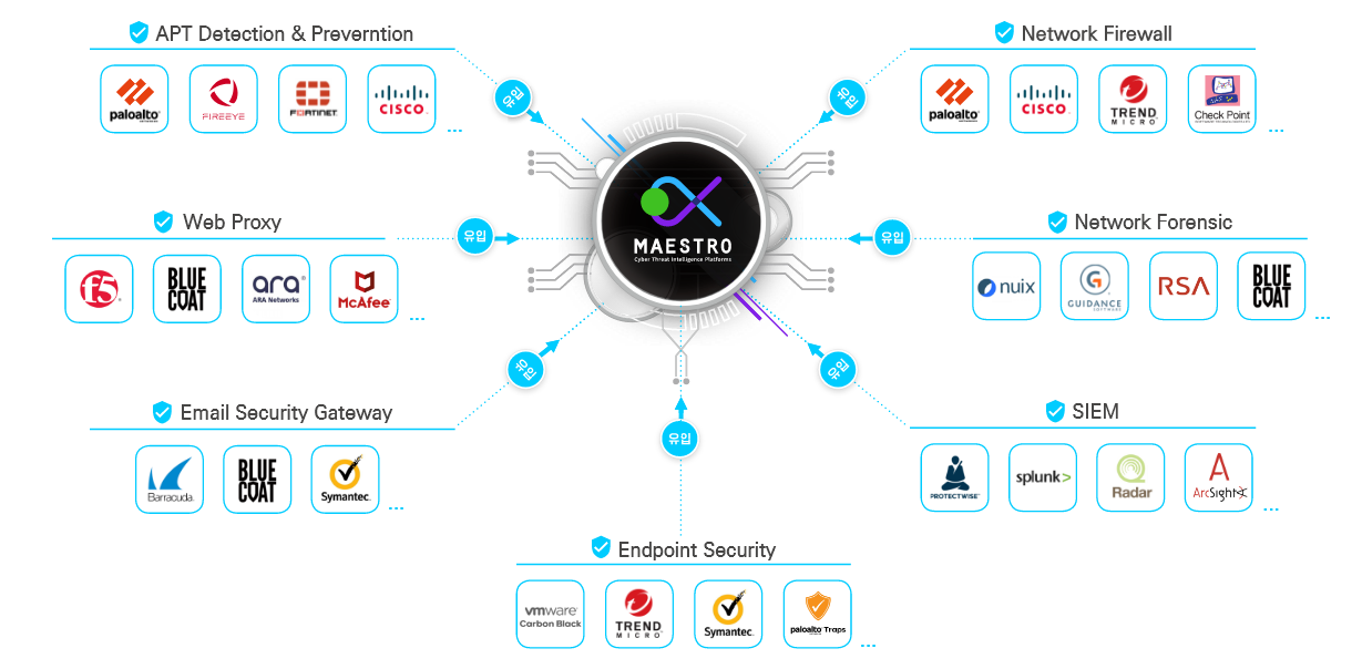 마에스트로 CTIP는 파일 유입과 검증을 위해 다양한 네트워크 보안 솔루션들과 연동 가능합니다.